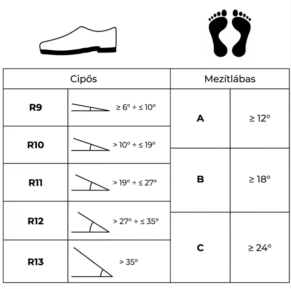 - R-érték: cipőtalpas használat; A/B/C: mezítlábas, vizes felület.